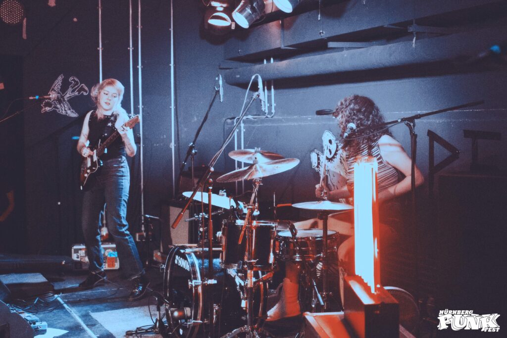 Anschließend ging es erstmals in den Festsaal, mit rund 450 Plätzen der größte Raum des Festivals (Zentralcafé und Kulturkellerei fassen jeweils etwa 200 Personen). MARCH aus den Niederlanden begrüßten das Publikum mit klassischem Punkrock. Frontfrau Fleur van Zuilen gab die energetische Anführerin, die der Menge ordentlich einheizte. Mir persönlich fehlten allerdings ein paar Ecken und Kanten. Die bekam ich danach bei CAVA, einem Berliner Garage-Duo, bestehend aus Peppi und Mela an Gitarre und Bass. Sie erinnerten mich stellenweise an GURR, klangen aber deutlich härter. Bereits im Vorfeld war „Copy and Paste“ mein meistgehörter Song auf der NPF-Playlist – und auch live überzeugte mich die Band. Das lag an den sympathischen Ansagen, am Instrumentenwechsel mitten im Set und natürlich an der Musik selbst.