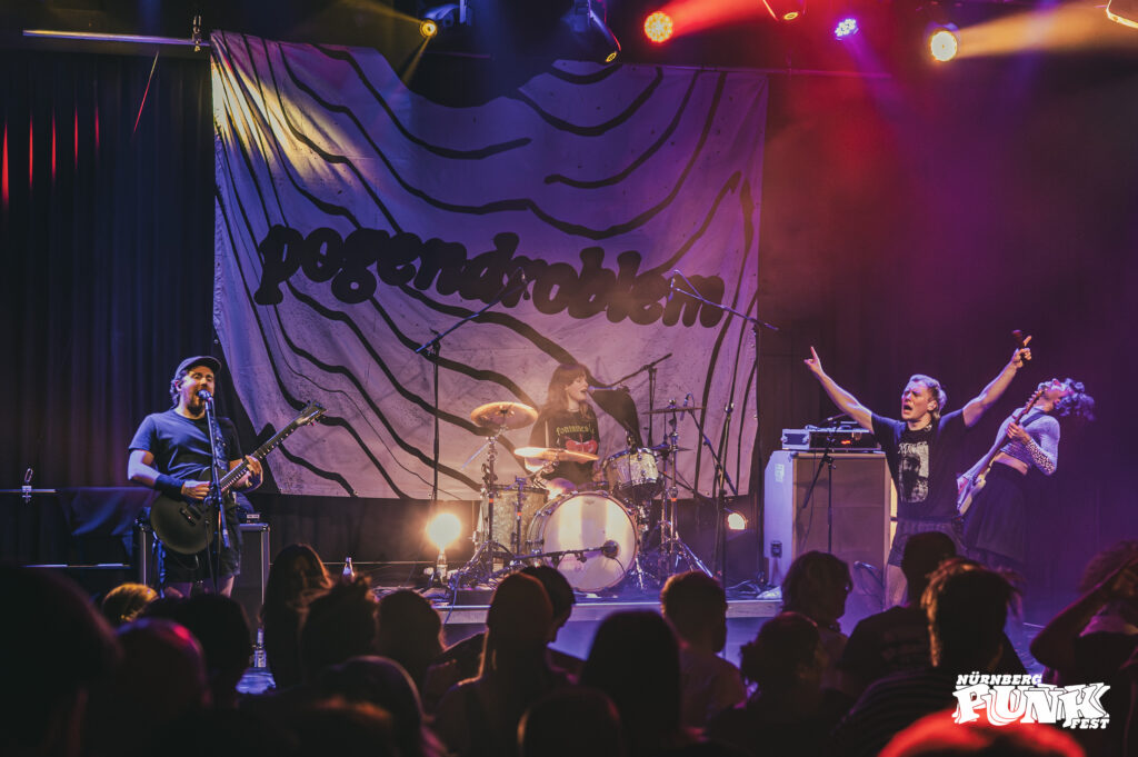 So zum Beispiel bei BSK, die mit ihrem Auftritt einen echten Homerun hinlegten. Das textsichere Publikum konnte nahezu jeden Song mitgrölen, vor der Bühne wurde getanzt, was das Zeug hielt. BSK bewegen sich irgendwo im Funpunk, ohne dabei ins Banale abzurutschen – anders als etwa WIZO (die Punkpolizei möge Nachsicht walten lassen). Das machte richtig Spaß. Dennoch verließ ich das Konzert etwas früher, um pünktlich zu POGENDROBLEM zu kommen – 15-Minuten-Regel verpflichtet.